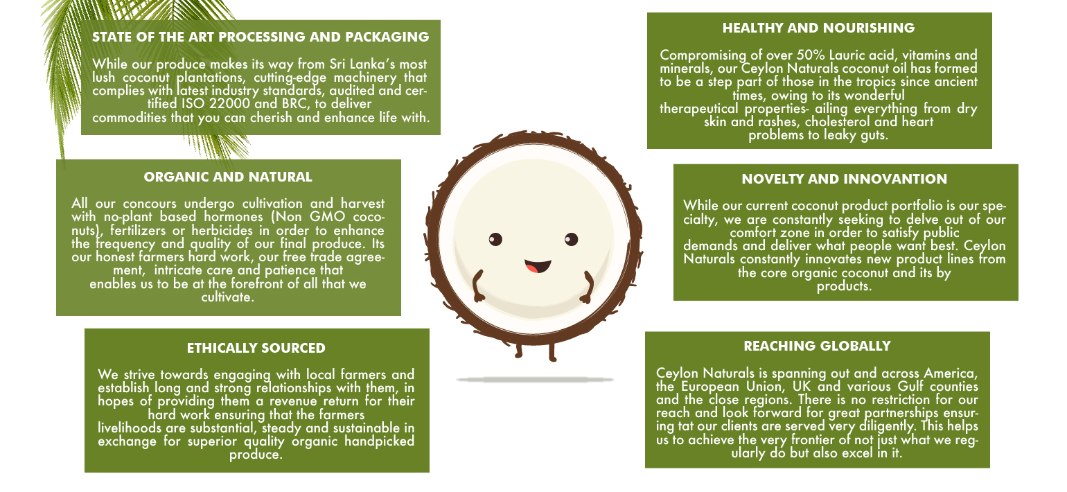 Ceylon Naturals is renowned for manufacturing and exporting a wide range of organic coconut products in Sri Lanka. A pioneer in manufacturing Organic Extra Virgin Coconut oil & Organic coconut products we at Ceylon Naturals believe it is more of a lifestyle, starting with how it is free of genetic modification, synthetic pesticides or mineral fertilizers.
